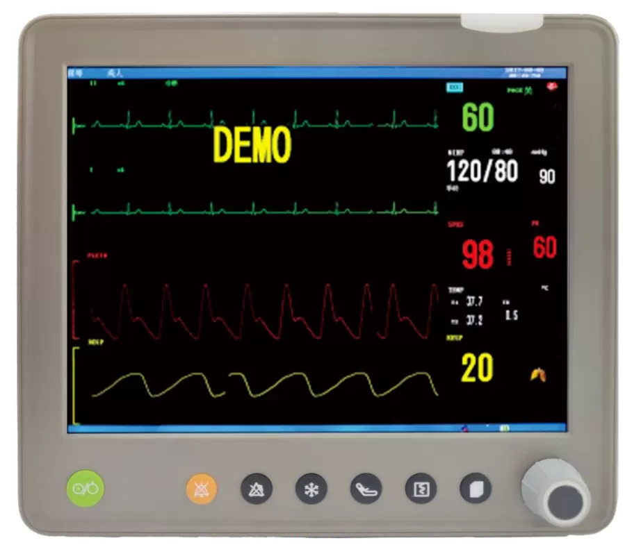 Nagy multi monitor, 12'1 TFT-LCD érintő képernyő, defibrilláció elleni védelem, hangszín állítás, pulzoximéter + nem invazív vérnyomásmérés + testhőmérséklet+légzés. 3,8 kg, 5 csatornás, méret: 295 mm x 123 mm x 265 mm